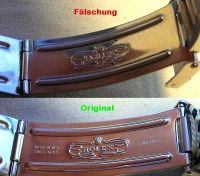 Man vermisst bei Billig-Plagiaten die Rolex typischen Gravuren an der Schliesse. Desweiteren ist das Rolex Logo nicht so filigran gezeichnet und die Verarbeitung bei genauerer Betrachtung mangelhaft.