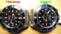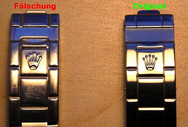 Man erkennt sofort, dass beim Plagiat die Bandglieder nicht geschraubt sondern gestiftet werden und sich das Armband einer Original Rolex Uhr deutlich vom Gewicht unterscheidet. Es ist dicker und schwerer als bei einer Fälschung. Auch die Schriftarten auf dem Ziffernblatt sind unterschiedlich.